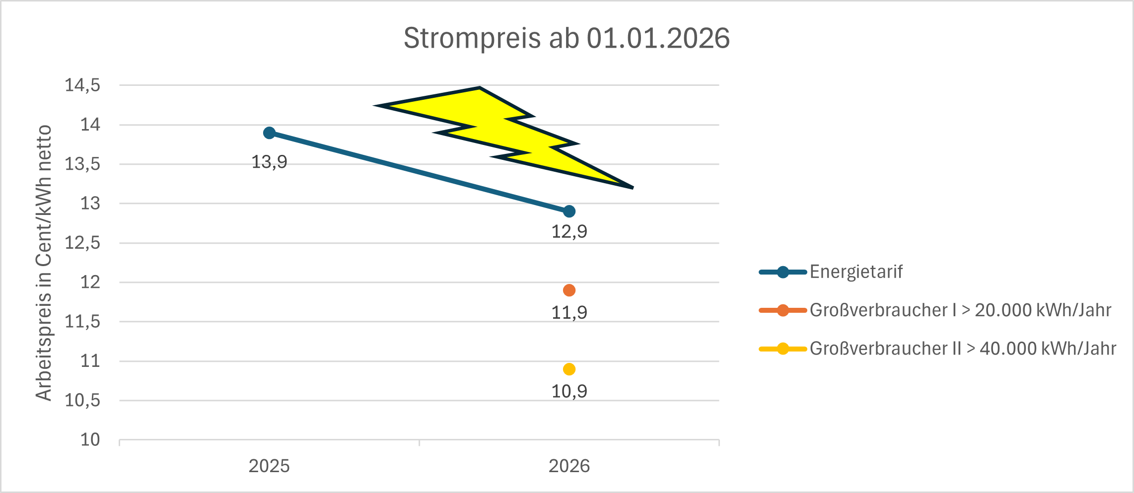 Im Mittelpunkt unserer Bemühungen steht, Sie zuverlässig und mit bestem Service, mit Energie zu beliefern! Das E-Werk Neumarkt passt seine Beschaffungsstrategie laufend am Strommarkt an und sorgt damit auch in anspruchsvollen Zeiten für ein sicheres Tarifangebot mit fairen Preisen. Ab 01.01.2026 wird der Strompreis auf 12,90 Cent/kWh netto (15,48 Cent/kWh brutto) gesenkt und für Groß- bzw. Gewerbekunden gibt es ebenfalls niedrigere Staffeltarife bis 10,90 Cent/kWh netto. Die Einspeisetarife für Erzeugungsanlagen bleiben unverändert zum Vorjahr. Die Kunden werden in einem eigenen Schreiben über die Details dazu informiert. Das E-Werk Neumarkt zählt damit weiterhin zu den günstigsten Anbietern aus dem Bezirk Murau. Weiters geht aus dem Begutachtungsentwurf für die Systemnutzungsentgelte der Energie-Control Austria hervor, dass es in der Steiermark zu einer leichten Senkung der Netztarife kommen wird.